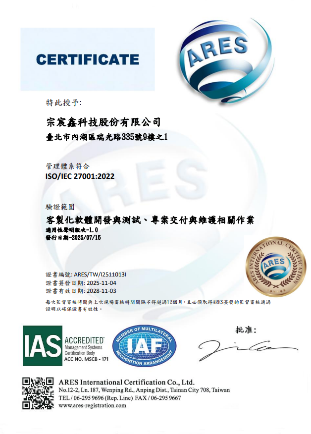 本公司依據ISO 27001:2022資訊安全、網路安全及隱私保護-要求事項,建立並實施嚴謹的資訊安全管理系統(ISMS),識別並降低資訊安全風險以確保本公司資訊資產及資料的機密性、完整性與可用性。 並於提供客戶專案服務過程中符合資訊安全的要求。 取得ISO 27001資訊安全管理國際標準驗證,代表著我們對客戶的莊嚴承諾。我們將持續監控、評估、強化全體員工的資訊安全知識與技術,並優化我們的資訊安全管理實務,確保ISO 27001驗證的有效性,以保護本公司及客戶資料與機密資訊免受威脅及創造客戶價值。